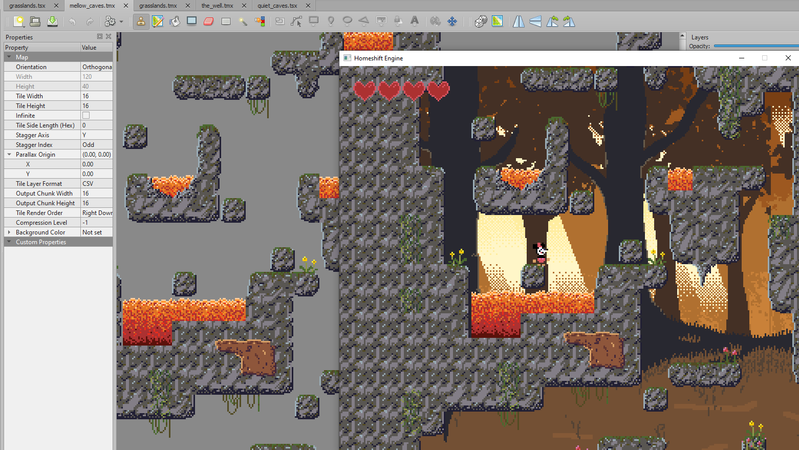 Tilengine has made handling levels and rendering rather painless. It has built in support for loading .tmx files from Tiled, as well as out of the box parallax layers and other graphical effects, such as CRT- and per scanline filters.
