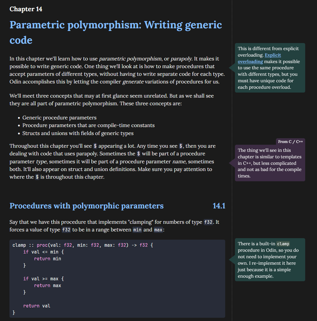 On top of how to write Odin code, this book also provides explanations of why things work the way they do. A programming language is a tool. By understanding your tools, you will become a better craftsperson.